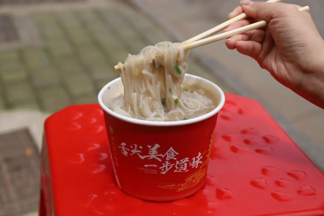 这家店格外的货真价实,每一根粉上都裹上一层厚厚的鱼糊,奶色的汤汁藏着无数鲜香的胡椒粉,每一口都是花费时间熬煮鱼肉留下的鲜香。再配上刚出锅的油条,把油条掐成一小段一小段的,浸到碗里,吃起来简直是妙不可言。