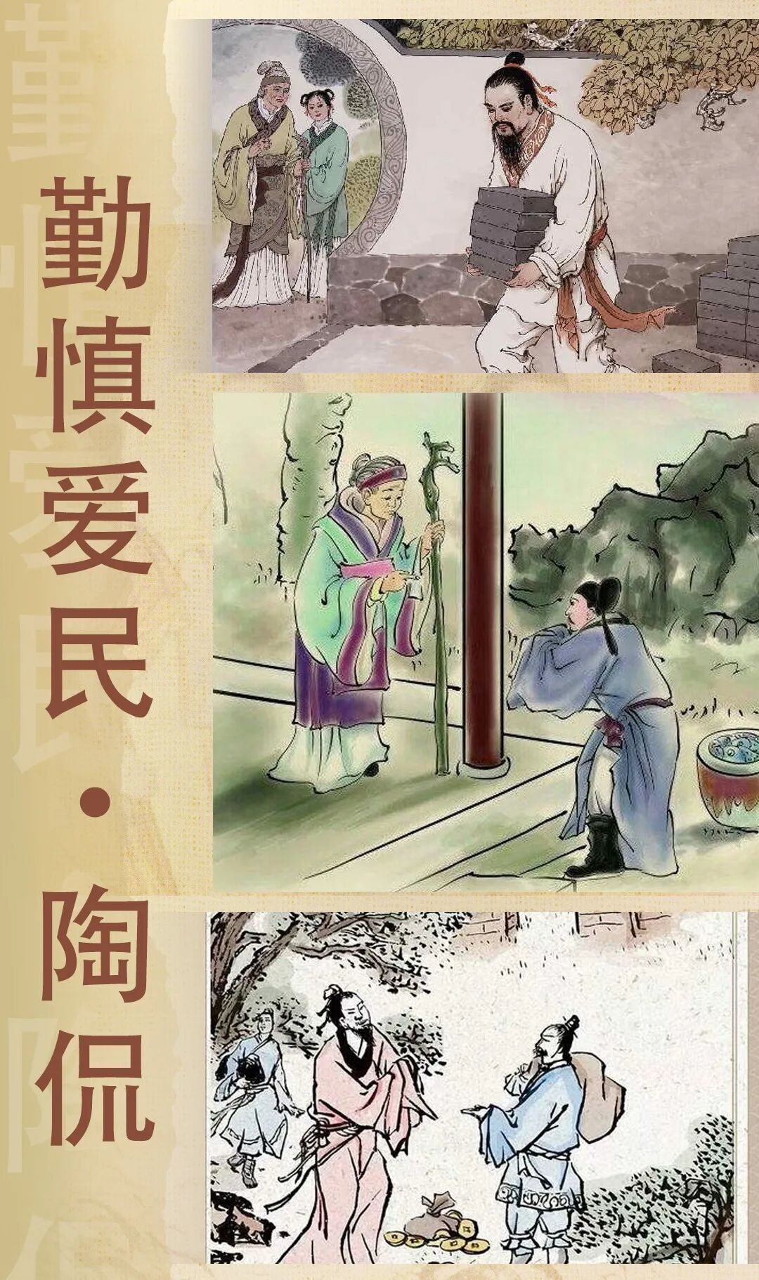 一次县衙聚会,陶侃喝得酩酊大醉。酒醒后,母亲垂泪责备道:“饮酒无度,怎能指望你刻苦自励,为国家建功立业?”陶侃羞愧难当,并答应母亲从此严于律己,饮酒不过三杯。任武昌太守时,陶侃宴请名士,无论众人如何劝酒,他也过三杯不饮,并凛然道:“中国尚未统一,怎可贪杯。”