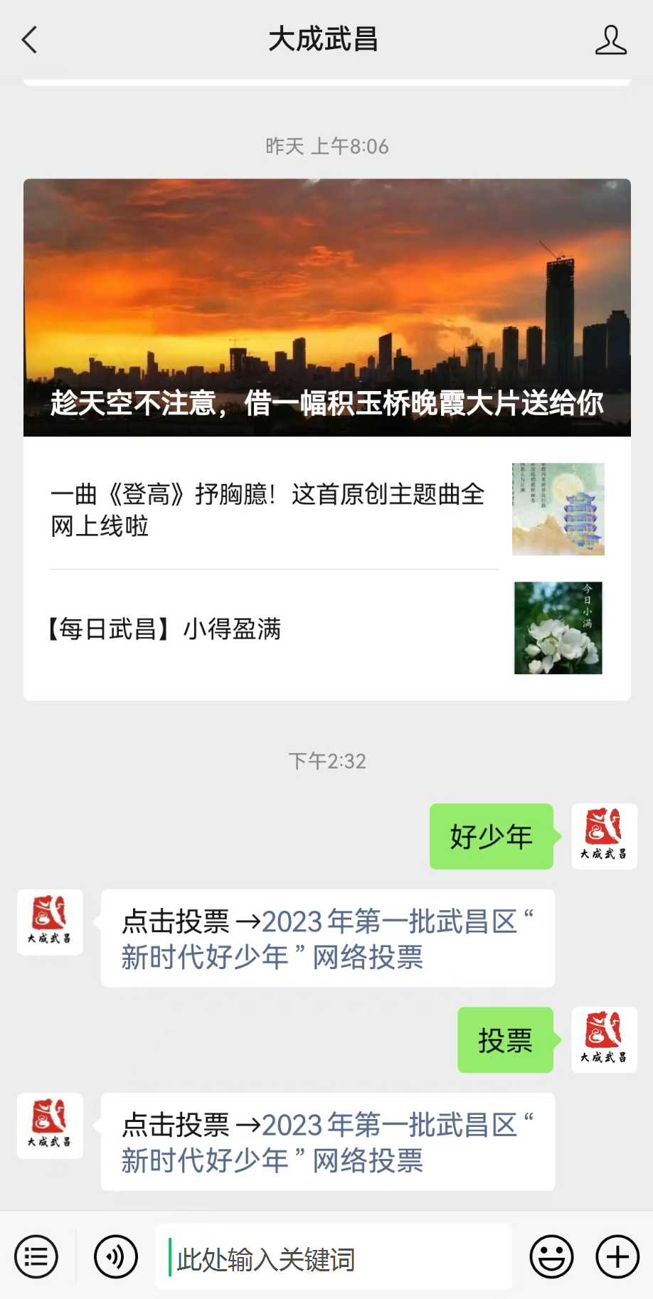 3、方法二:在对话框中输入关键词“投票”“新时代好少年”“好少年”即可进入投票页面,为您支持的“好少年”点赞。